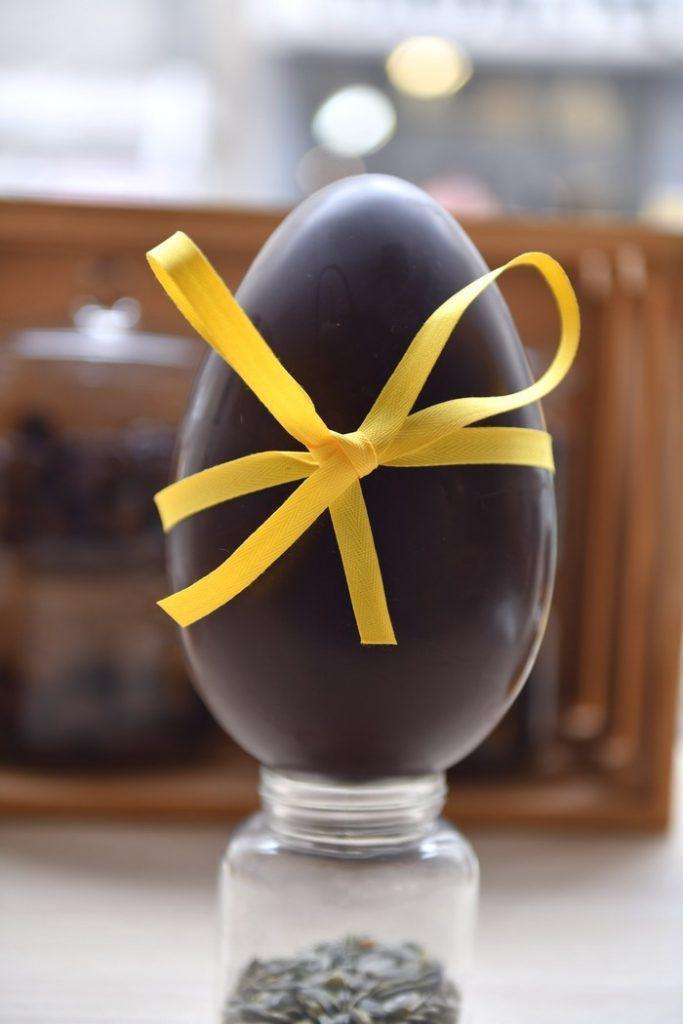 - l’autre œuf est fabriqué avec notre excellent chocolat noir 70% Equateur. A l’intérieur se cachent 15 œufs noisettes noir